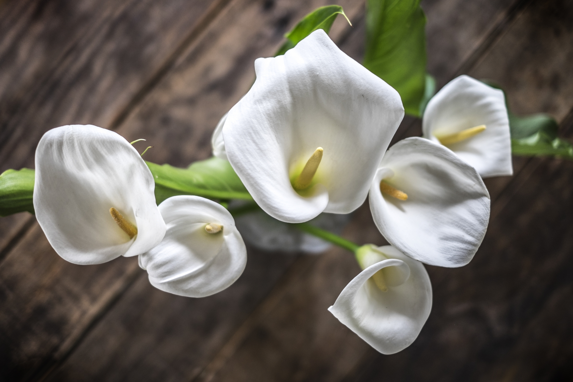 その凛とした佇まいで静かに存在感を放つのが、カラーです。すらりと伸びた茎の先に、まるで一筆の絵画のように咲く花姿は、シンプルでありながら圧倒的な美しさを持ち、「奇跡の花」とも呼ばれます。純白をはじめ、ピンクや紫、イエローなど多彩な色合いがあり、それぞれに異なる印象で魅せてくれます。